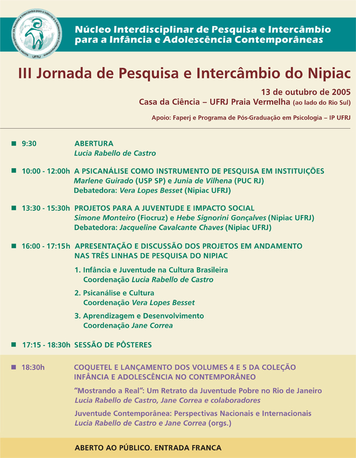 A III Jornada de Pesquisa e Intercâmbio do NIPIAC foi realizada no dia 13 de outubro de 2005, das 9:30 às 18:30hs, na Casa da Ciência – UFRJ Praia Vermelha. Nela foram abordados temas como “A psicanálise como instrumento de pesquisa em instituições” e “Projetos para a juventude e impacto social”, com a participação de docentes e pesquisadores brasileiros e estrangeiros, e estudantes da graduação e pós-graduação.